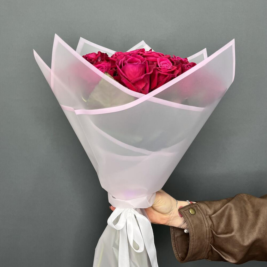 На фото букет из 21 малиновой розы. В составе: роза 21 шт, дизайнерская упаковка 2 шт, атласная лента 1 шт, . Все цветы свежие и ароматные, букет красиво оформлен и отлично подходит для подарка. Доступна доставка цветов или самовывоз.